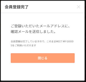 ご登録いただいたメールアドレスに「MEET MY GOODS アカウント登録完了のお知らせ」という確認メールが届いていますので、メール本文内のURLをクリックして、確認を完了してください。